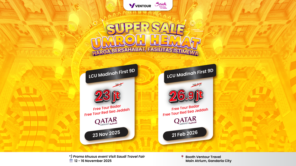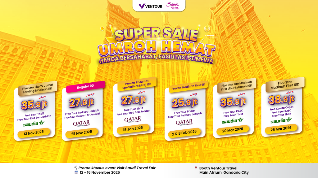 Kabar gembira untuk sahabat yang sudah lama menantikan waktu terbaik berangkat Umroh! Selama event Visit Saudi Travel Fair 2025, Ventour Travel menghadirkan Super Sale Umroh Hemat dengan harga yang bersahabat dan fasilitas istimewa.
