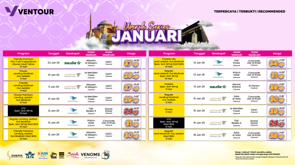 Tahun 2026, Ventour Travel menyiapkan banyak pilihan paket umroh 2026 yang bisa disesuaikan dengan waktu dan kebutuhan sahabat. Mulai dari paket Umroh Series Januari, Series Februari, Series Ramadhan, hingga Series Syawal, semua dirancang untuk memaksimalkan kenyamanan ibadah di setiap musim keberangkatan.