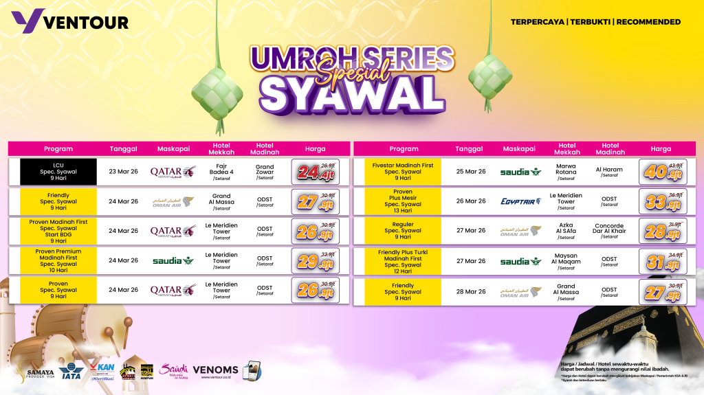 Lagi cari paket umroh 2026? Ventour hadir dengan layanan full service, fasilitas All In, harganya mulai 25 jutaan, Free Bonusnya bikin kaget!